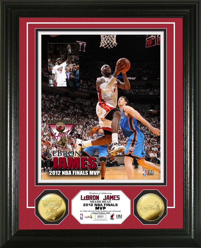 初のファイナルMVPに輝いたレブロン・ジェイムスを収めた8 x 10 インチフォトと、2012NBAファイナル優勝仕様のゴールドコイン2枚を額装。