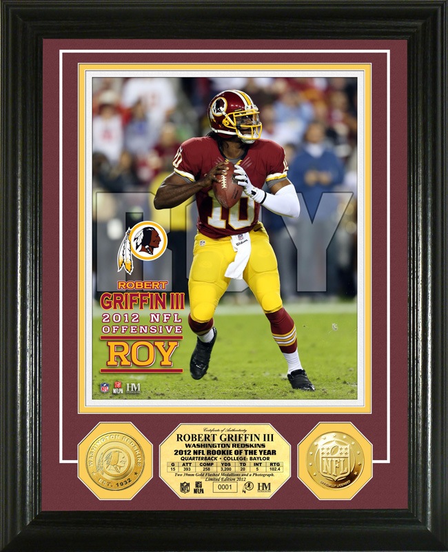 ロバート・グリフィン3世の8×10フォトと、ワシントン・レッドスキンズのロゴ入りゴールドコイン1枚、NFLロゴ入りゴールドコイン1枚を額装!