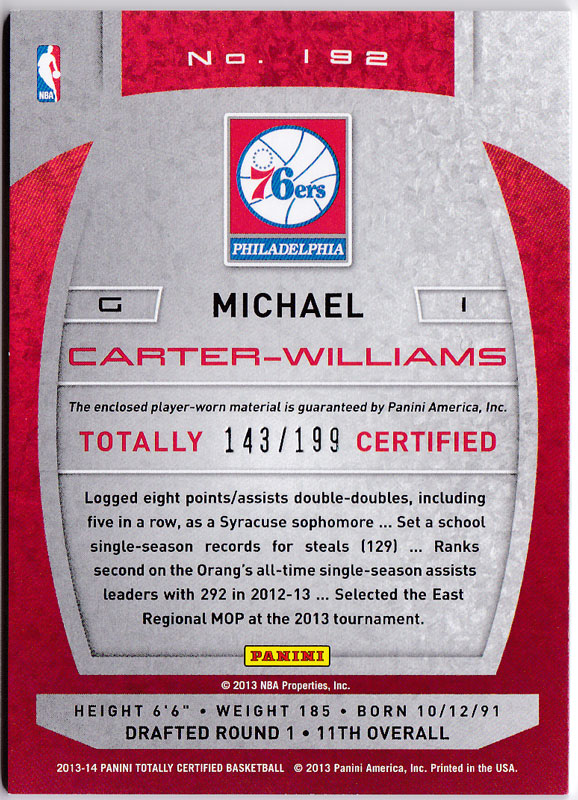 マイケル・カーター・ウィリアムス 2013-14 Panini Totally Certified Materials Red Michael Carter Williams 143/199