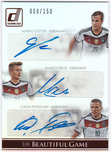 マリオ・ゲッツェ / マルコ・ロイス / ルーカス・ポドルスキ 2015 Panini Donruss The Beautiful Game Triple Signatures Auto 008/150 直筆サインカード / Mario Gotze / Marco Reus / Lukas Podolski