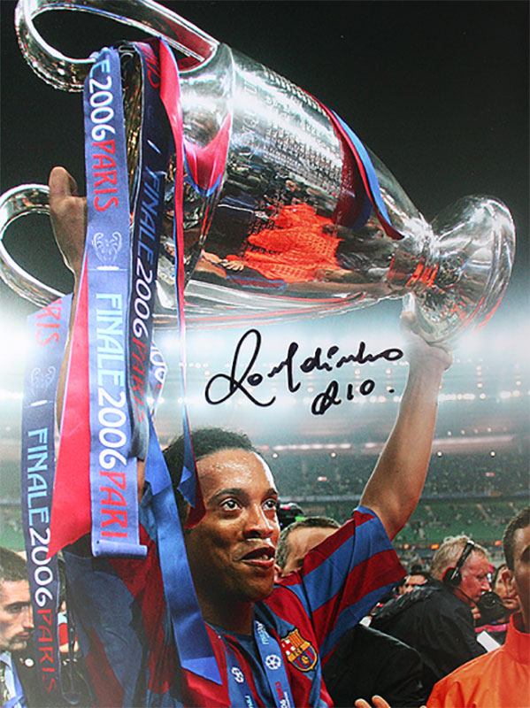 ロナウジーニョ 直筆サインフォト バルセロナ 2006 UEFA チャンピオンスリーグ ウィナー 縦型 (Ronaldinho Signed Barcelona Photo: 2006 UEFA Champions League Winner)