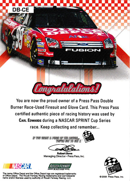 カール・エドワーズ 2008 Press Pass Double Burner Race-Used Card 060/100 Carl Edwards