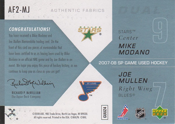 マイク・モダノ/ジョー・マレン 2007-08 SP Game Used Authentic Fabrics Dual 096/100 Mike Modano & Joe Mullen