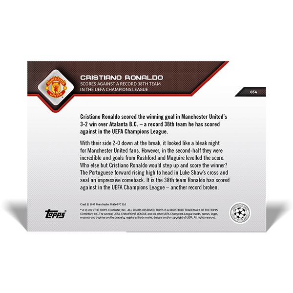 クリスティアーノ・ロナウド #054 クリスティアーノ・ロナウド選手がチャンピオンズリーグで38チームに対してゴールを記録した記念カード Scores against a record 38th team in the UEFA Champions League UCL Topps Now Card 11/29入荷