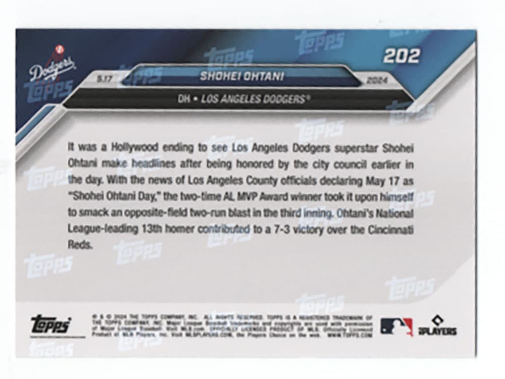 大谷翔平 #202 LAで制定されたOhtani Dayでホームランを打った記念カード- SuperStar Belts Homer On Shohei Ohtani Day in LA - Shohei Ohtani 2024 Topps Now Card 6/12入荷