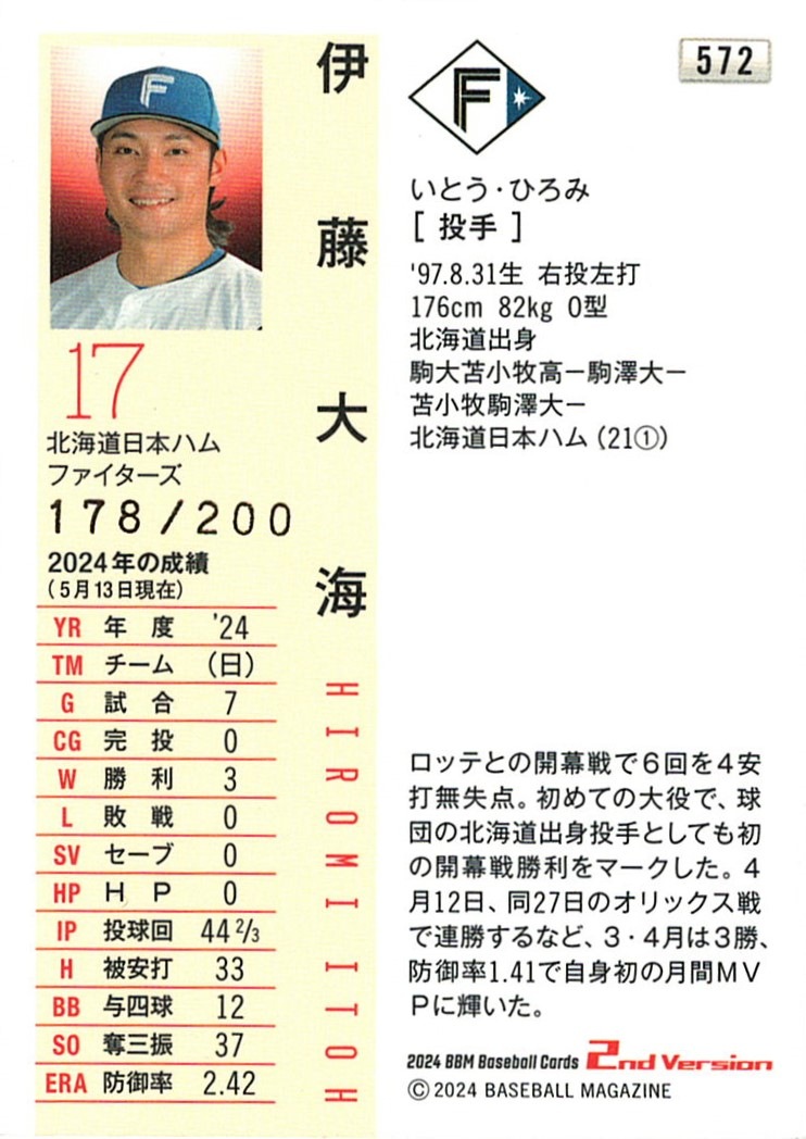 伊藤大海【2024 BBM ベースボールカード 2ndバージョン】 178/200