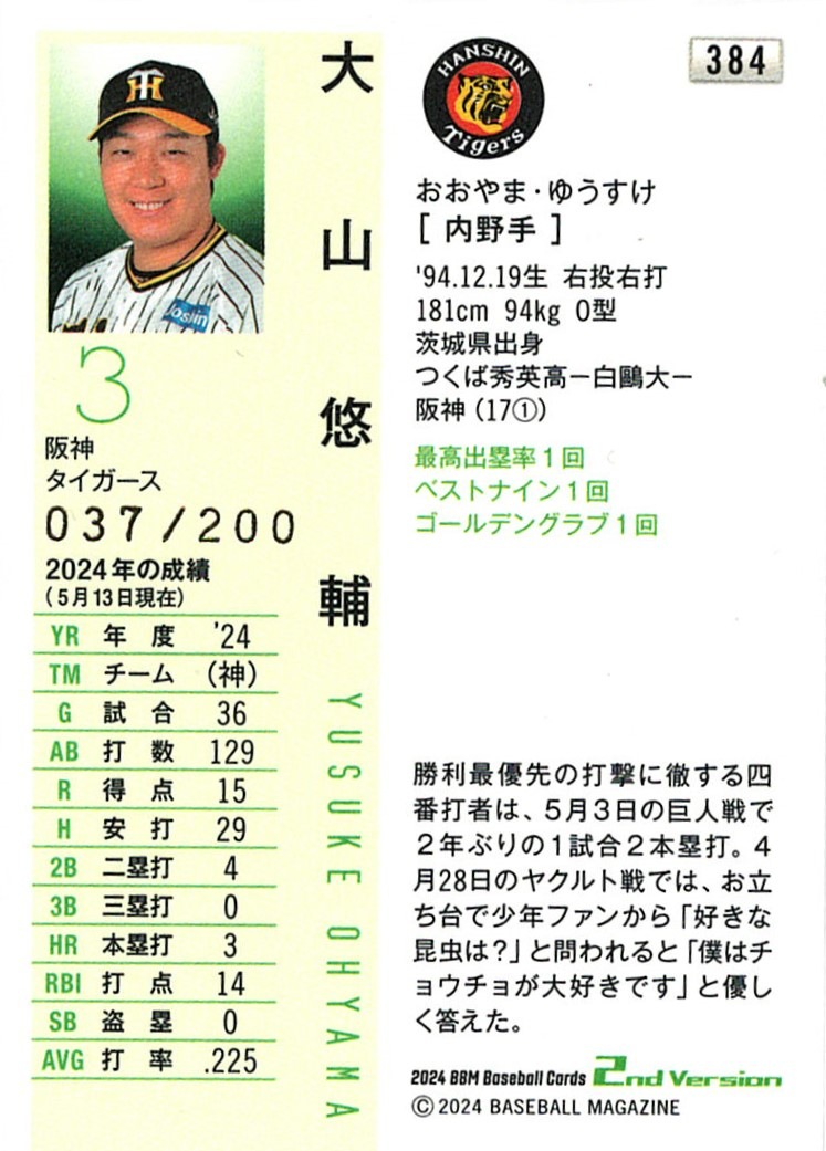 大山悠輔【2024 BBM ベースボールカード 2ndバージョン】 037/200