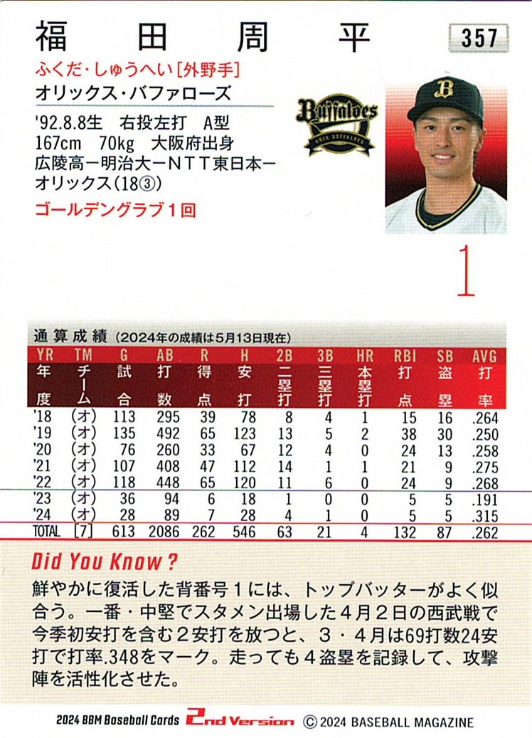 福田周平【2024 BBM ベースボールカード 2ndバージョン】