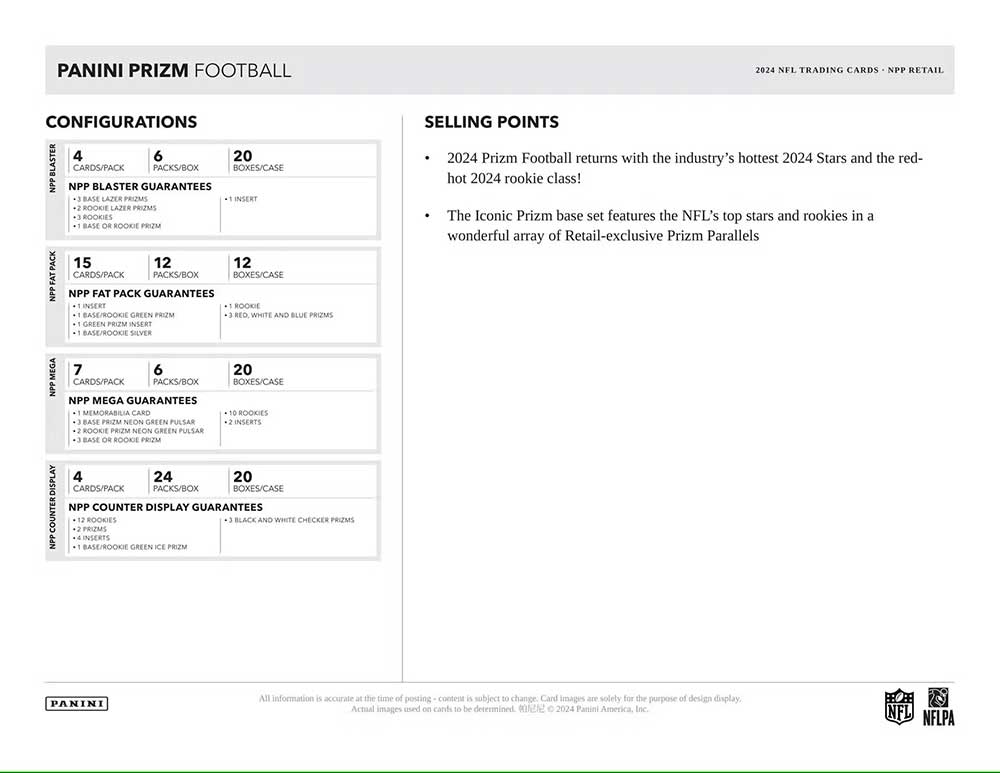 ★キラキラ光るプリズムパラレルで人気のパニーニ社のアメフトカード『NFL 2024 Panini Prizm Football』のFat Pack版(Value Pack)が発売されます!