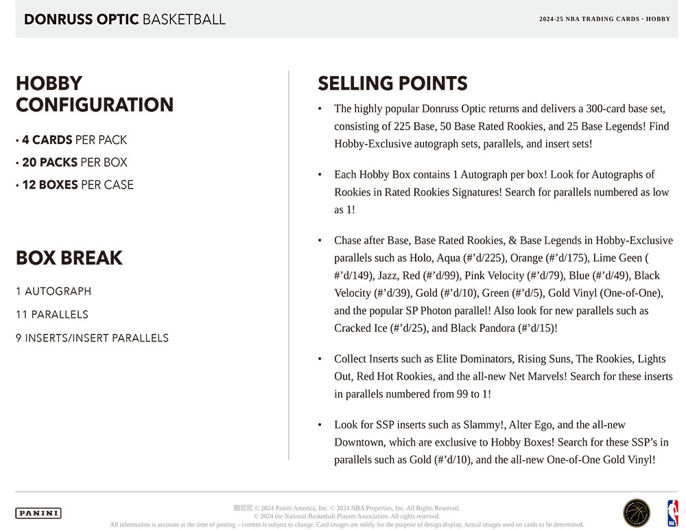 ★パニーニ社から『NBA 2024-25 Donruss Basketball』のデザインのカードを光り輝くオプティクローム技術で印刷した大人気バスケットボールカード『NBA 2024-25 Donruss Optic Basketball』のHobby版が発売されます!
