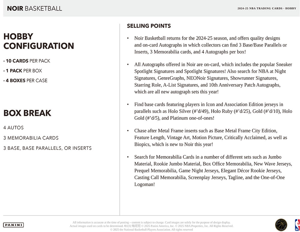 ★パニーニ社から白黒を基調としたバスケットボールカードの人気高級版『NBA 2024-25 Panini Noir Basketball』のHobby版が登場!