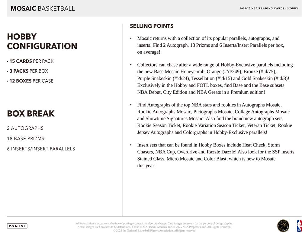 NBA 2024-25 Panini Mosaic Basketball Hobby Box 7/10入荷