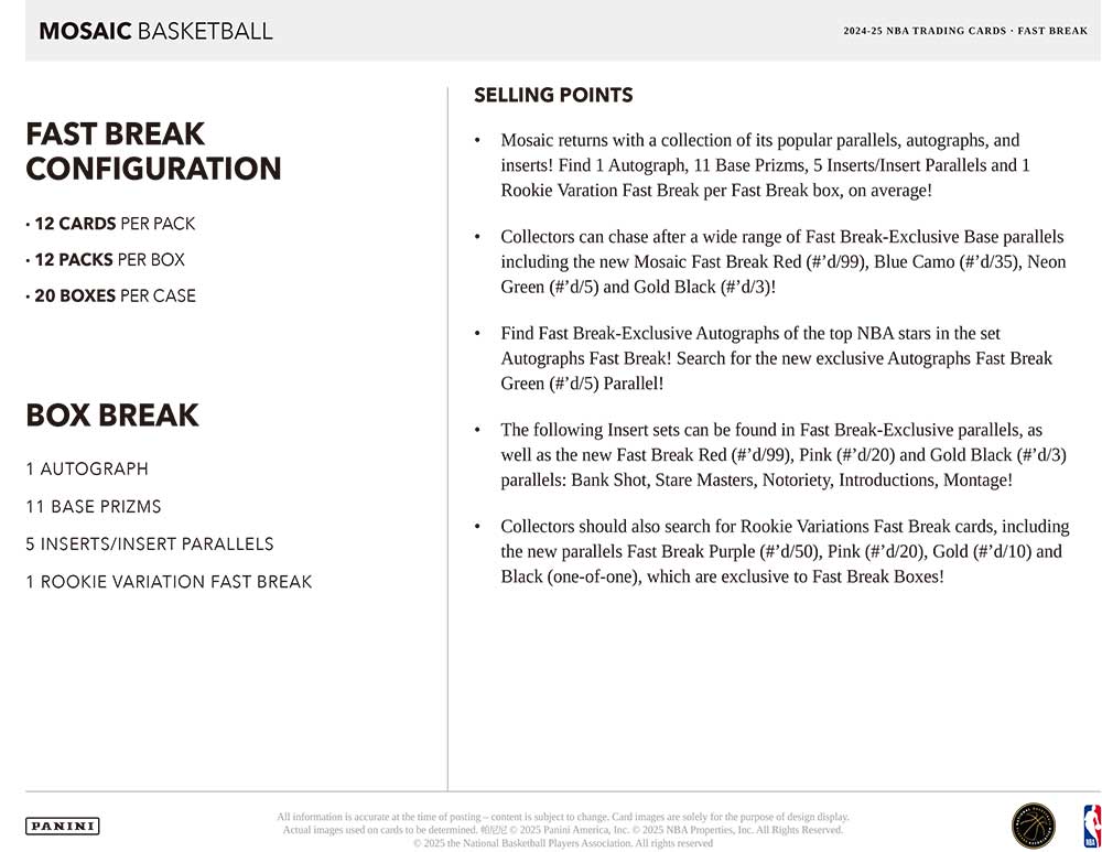 NBA 2024-25 Panini Mosaic Basketball Fast Break版 Box 8/2入荷