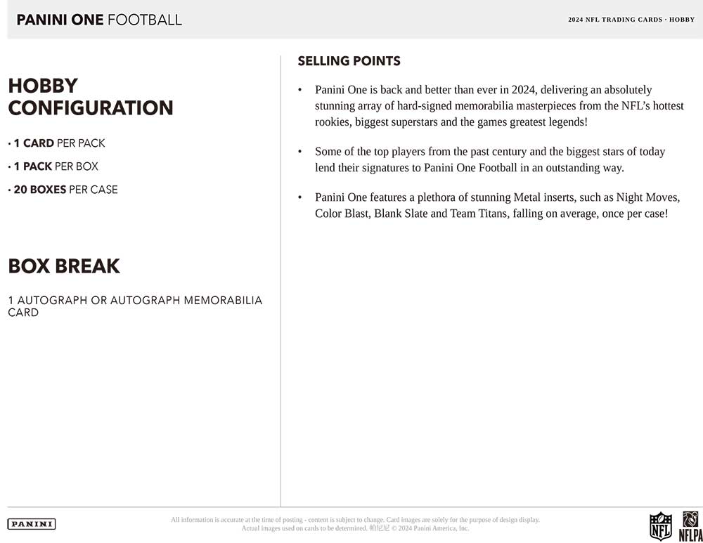 NFL 2024 Panini One Football Hobby Box 9/5入荷