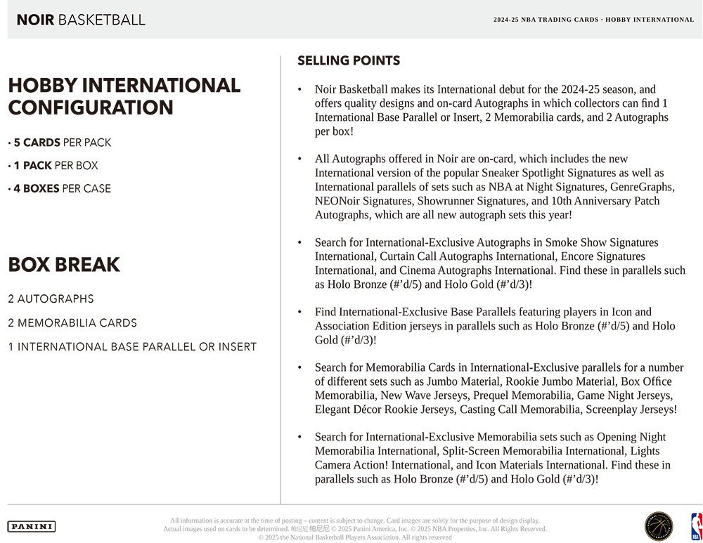 ★パニーニ社から白黒を基調としたバスケットボールカードの人気高級版『NBA 2024-25 Panini Noir Basketball』のHobby International版が登場!