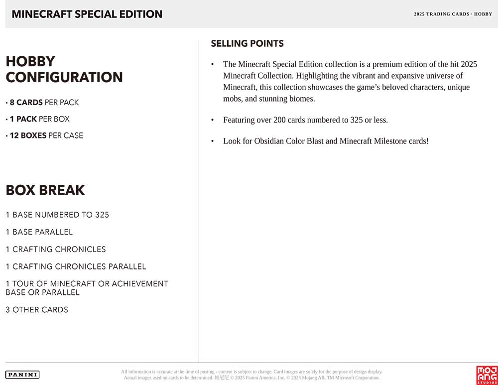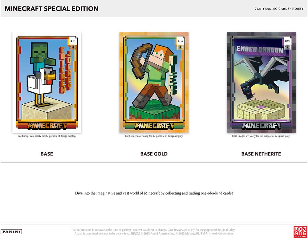 ★パニーニ社から、2014年当時の販売本数が6000万本となったことで「世界で最も売れたインディーゲーム」としてギネス世界記録に認定され、2020年には世界ビデオゲームの殿堂に選ばれ、2025年には実写映画化された人気のゲーム『Minecraft』(マインクラフト)のトレーディングカード『2025 Panini Minecraft Special Edition』のHobby版が発売されます!