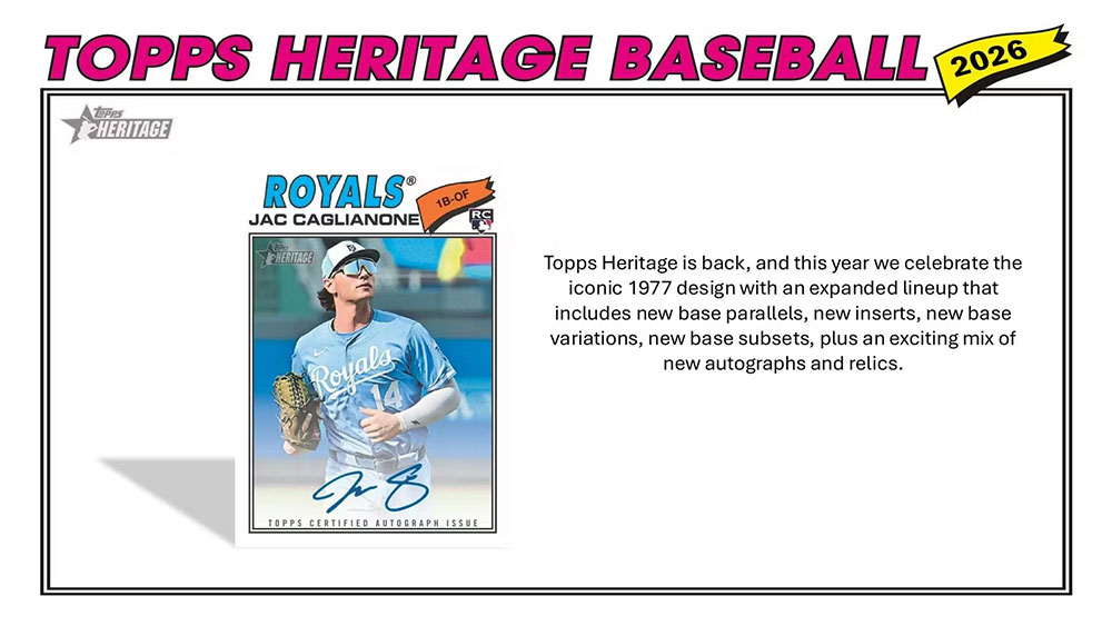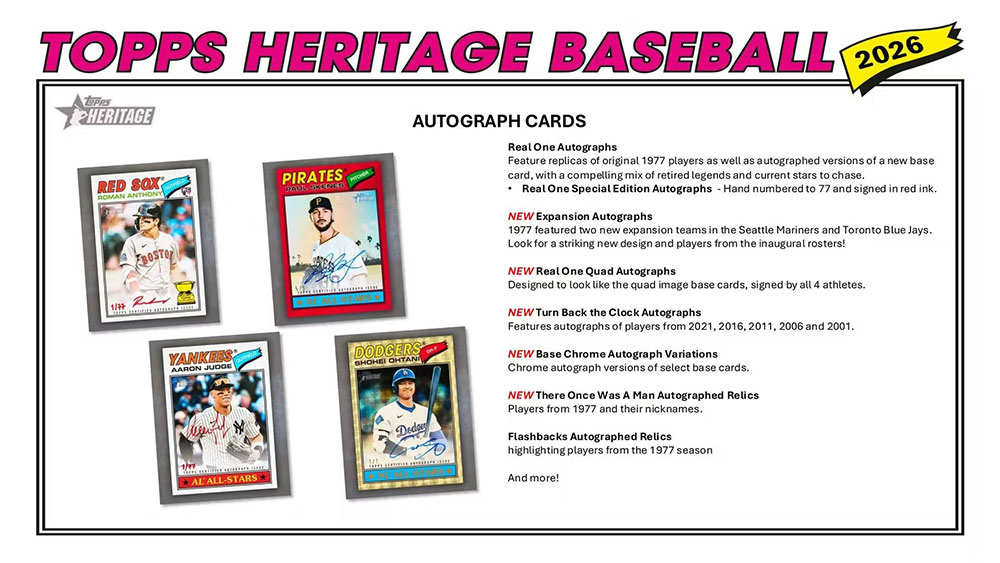 ★2026シーズンのHeritage Baseballは、新たなベースパラレルやインサート、ベースバリエーション、ベースサブセット、直筆サイン、メモラビリアカードなどが封入!